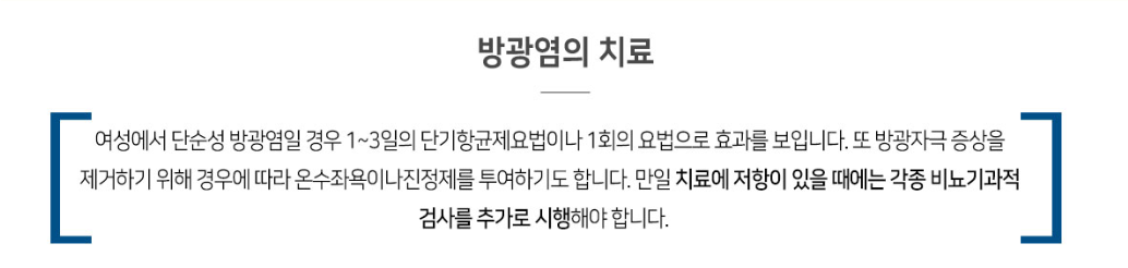 단순 방광염의 경우 1-3일의 단기항균제요법이나 1회의 요법으로 효과를 보입니다.