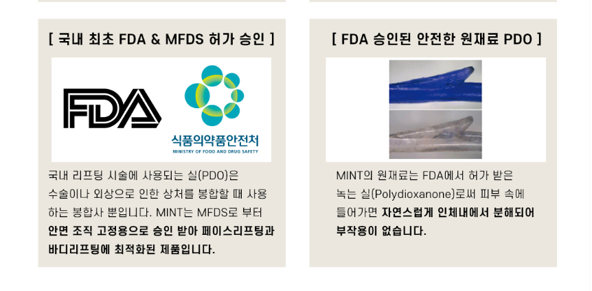 MINT의 원재료는 FDA에서 허가 받은 녹는실로써 피부 속에 들어가면 자연스럽게 인체내에서 분해되어 부작용이 없습니다