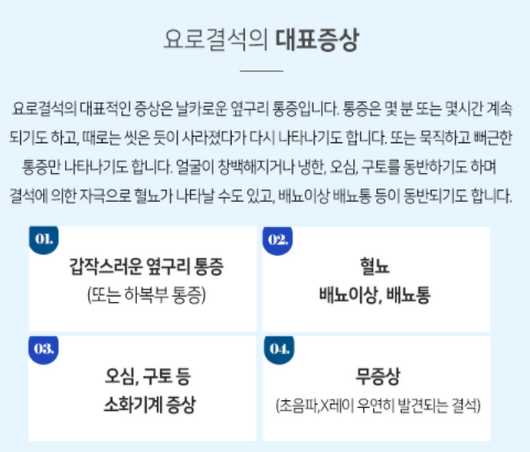 요로결석의 대표적인 증상은 날카로운 옆구리 통증입니다. 통증은 몇 분 또는 몇시간 계속 되기도 하고, 때로는 씻은 듯이 사라졌다가 다시 나타나기도 합니다. 또는 묵직하고 뻐근한 통증만 나타나기도 합니다. 얼굴이 창백해지거나 냉한, 오심, 구토를 동반하기도 하며 결석에 의한 자극으로 혈뇨가 나타날 수도 있고, 배뇨이상 배뇨통 등이 동반되기도 합니다