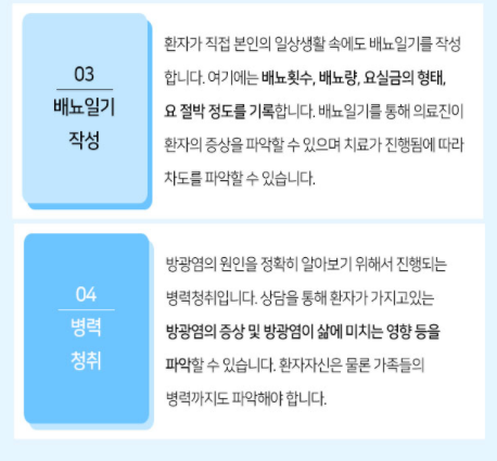 - 병력 청취 : 방광염의 증상 및 방광염이 삶에 미치는 영향 등을 파악할 수 있습니다