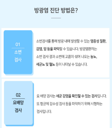 - 소변 검사 : 소변 검사를 통해 방광 내 발생할 수 있는 염증성 질환, 감염, 암 등을 파악할 수 있습니다.