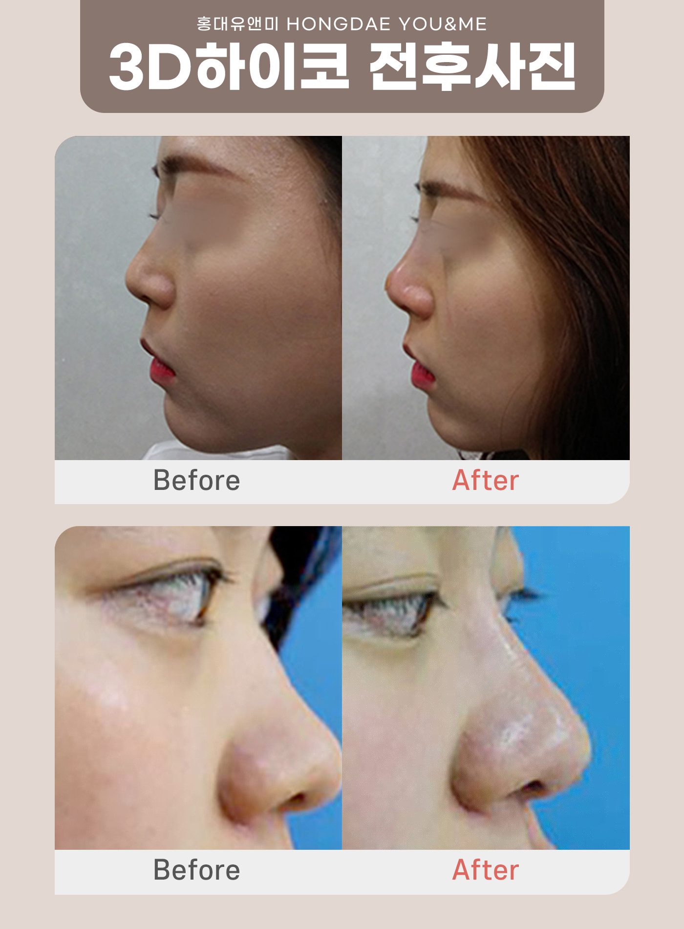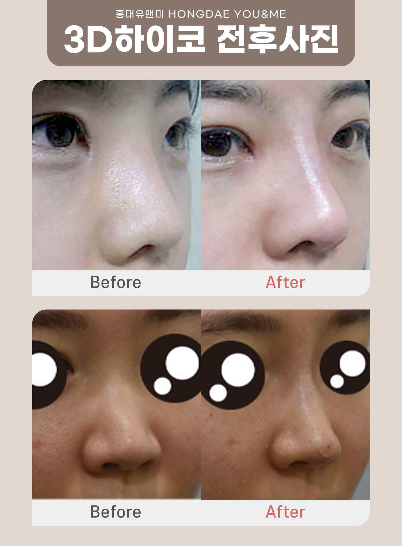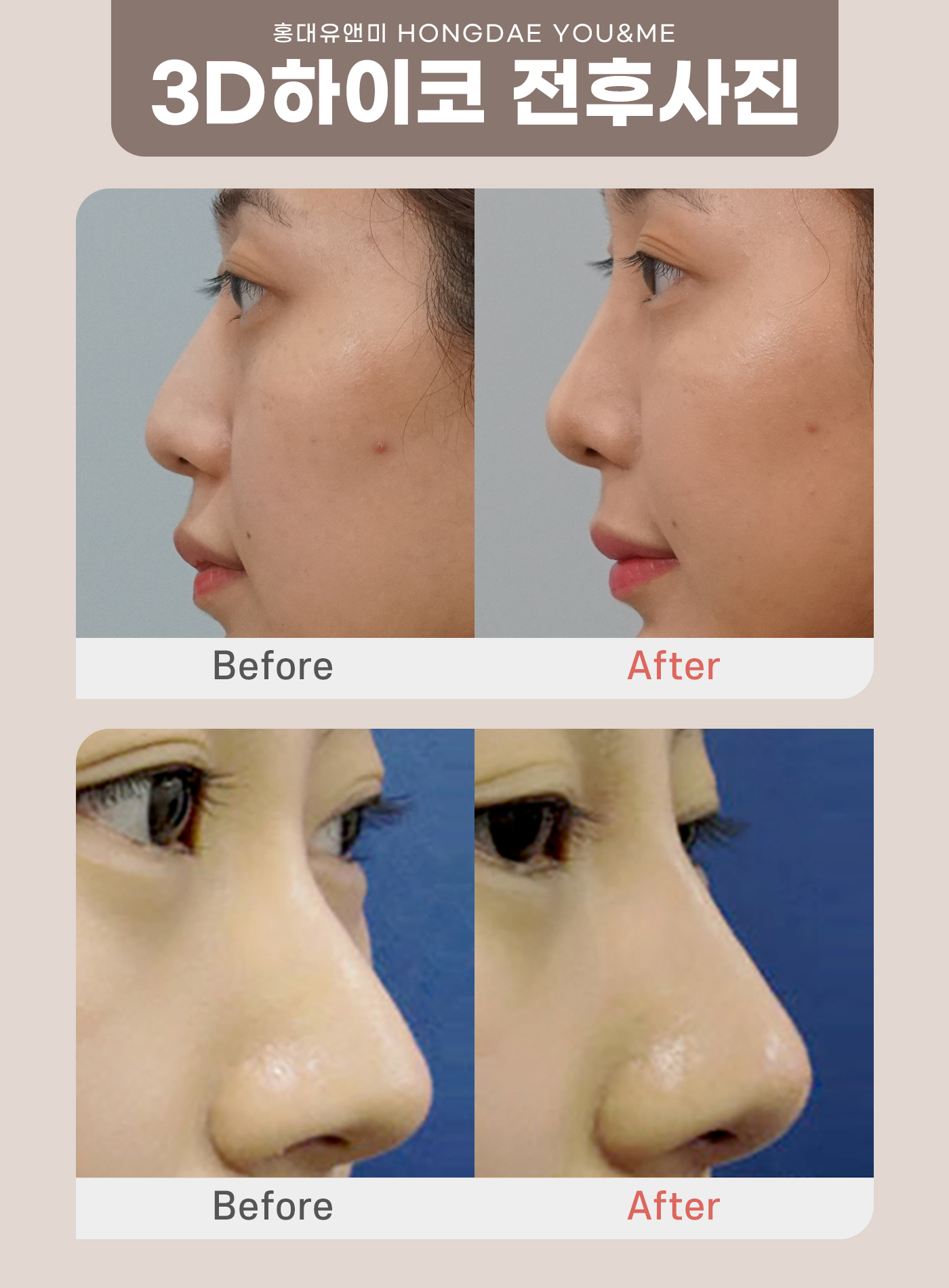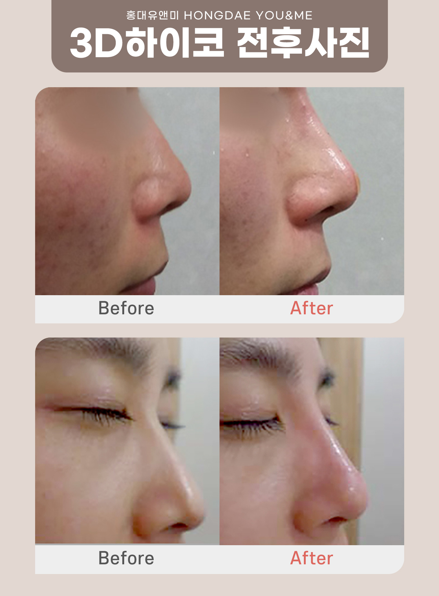3D 하이코는 유앤미 네트워크의 의료진이 개발한 하이코 전용 특수실과 인체에 무해한 HA필러를 결합하여 각기 다른 피부타입, 윤곽라인, 이목구비의 조화 등을 고려한 복합 코 교정 술 입니다. HA필러, 코끝리프팅과 콧대지지실, 콧볼 축소 보톡스를 활용하여 자연스러운 코 끝은 물론 높은 콧대 날렵한 콧볼을 완성할 수 있습니다.