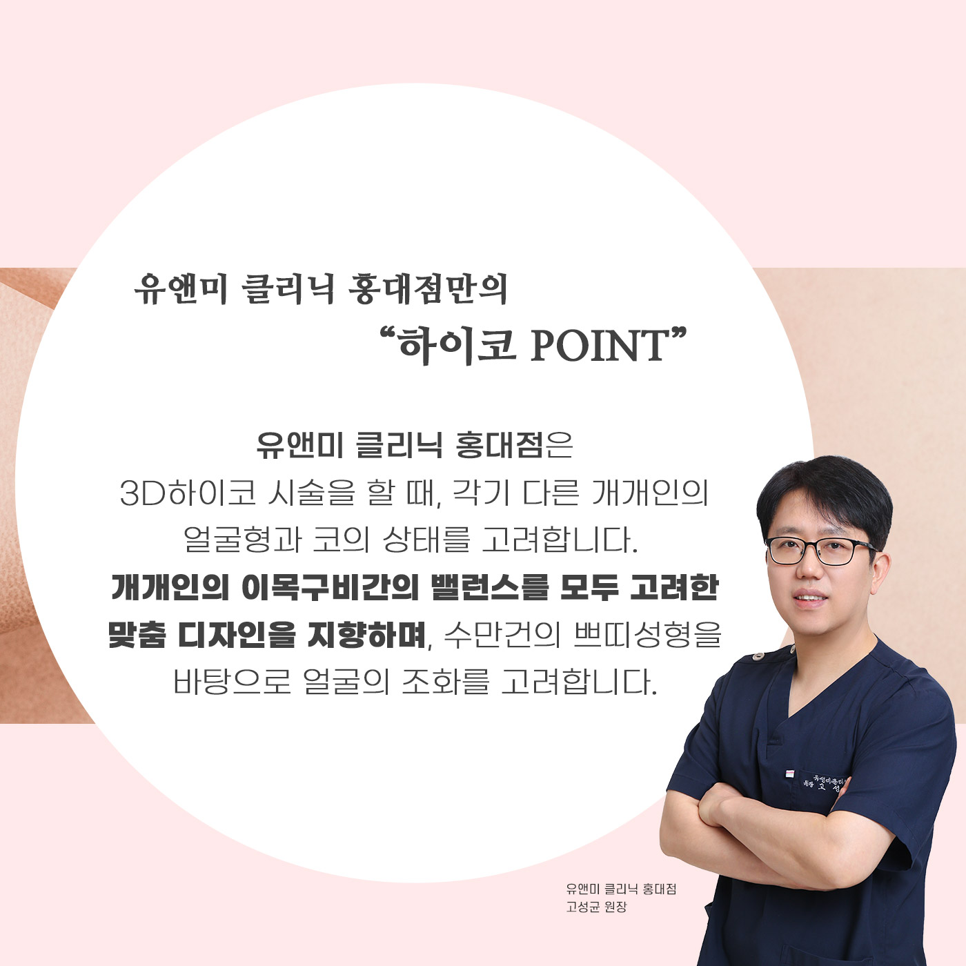 유앤미 클리닉 홍대점은 3D 하이코 시술을 할 때, 각기 다른 개개인의 얼굴형과 코의 상태를 고려합니다.