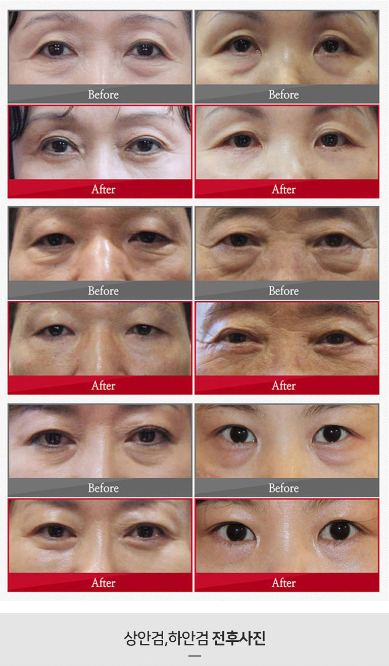 하안검은 1-1.5mm 밑을 절개하여 지방과 늘어난 피부와 근육을 절제해내고 당겨주어서 눈 밑이 리프팅 되어 팽팽하게 보이며, 깨끗해지는 효과를 볼 수 있습니다. 최근 미용 시술에 관심이 없던 부모님 세대의 시술이 늘어나고 높아진 관심에 따라 효도 성형 수술로도 많이 애용되고 있습니다.