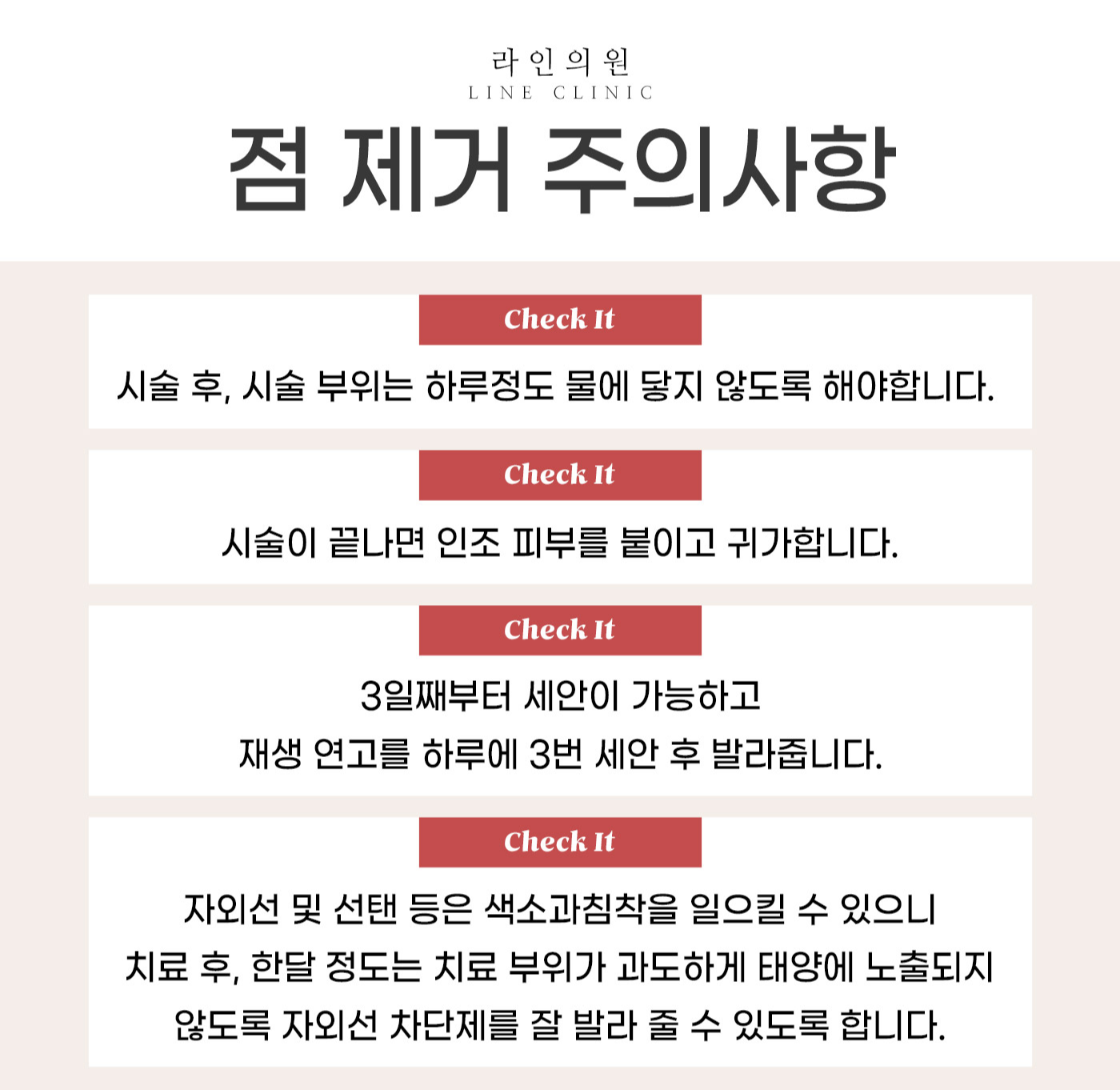 일산피부과 라인의원의 점빼기/점제거 시술 후 주의사항도 꼼꼼하게 안내해드려요. 시술 후에는 시술 부위를 하루 정도 물에 닿지 않도록 해야 하며, 인조 피부를 붙이고 귀가하게 돼요. 3일째부터 세안이 가능하고, 재생연고를 하루 3번 세안 후 발라주시면 돼요. 자외선 및 선탠은 색소 과침착을 일으킬 수 있으니 치료 후 한 달 정도는 치료 부위가 과도하게 태양에 노출되지 않도록 자외선 차단제를 잘 발라 주어야 해요.