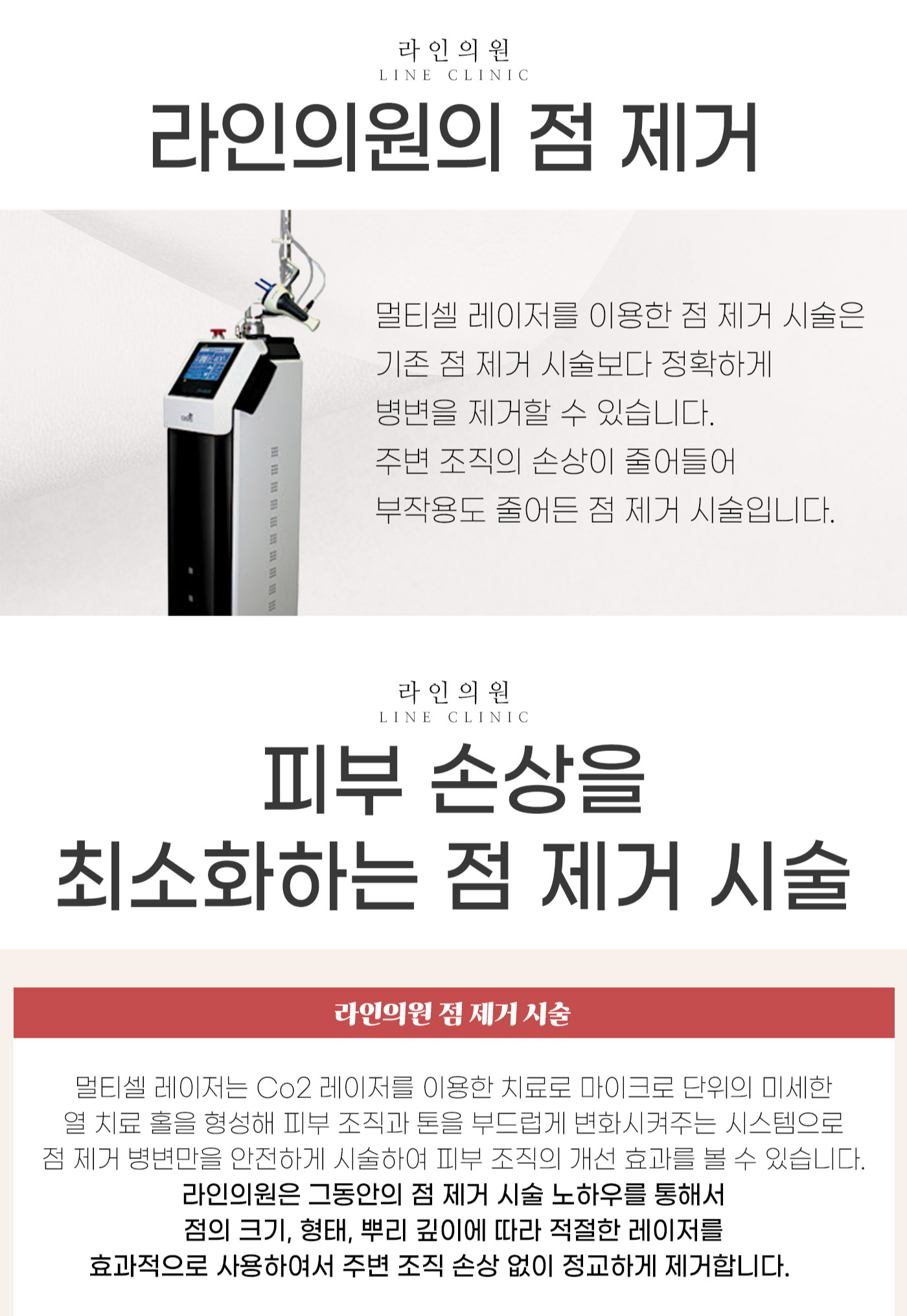 피부 손상을 최소화하는 일산피부과 라인의원의 점빼기/점제거 Key Point는 바로 멀티셀 레이저예요. 멀티셀 레이저는 Co2레이저를 이용한 치료로 마이크로 단위의 미세한 열 치료 홀을 형성해 피부 조직과 톤을 부드럽게 변화시켜주는 시스템이에요. 이를 통해 점제거 병변만을 안전하게 시술하여 피부 조직의 개선 효과를 볼 수 있어요. 라인의원은 점의 크기, 형태, 뿌리 깊이에 따라 적절한 레이저를 효과적으로 사용하여 주변 조직 손상 없이 정교하게 제거합니다.